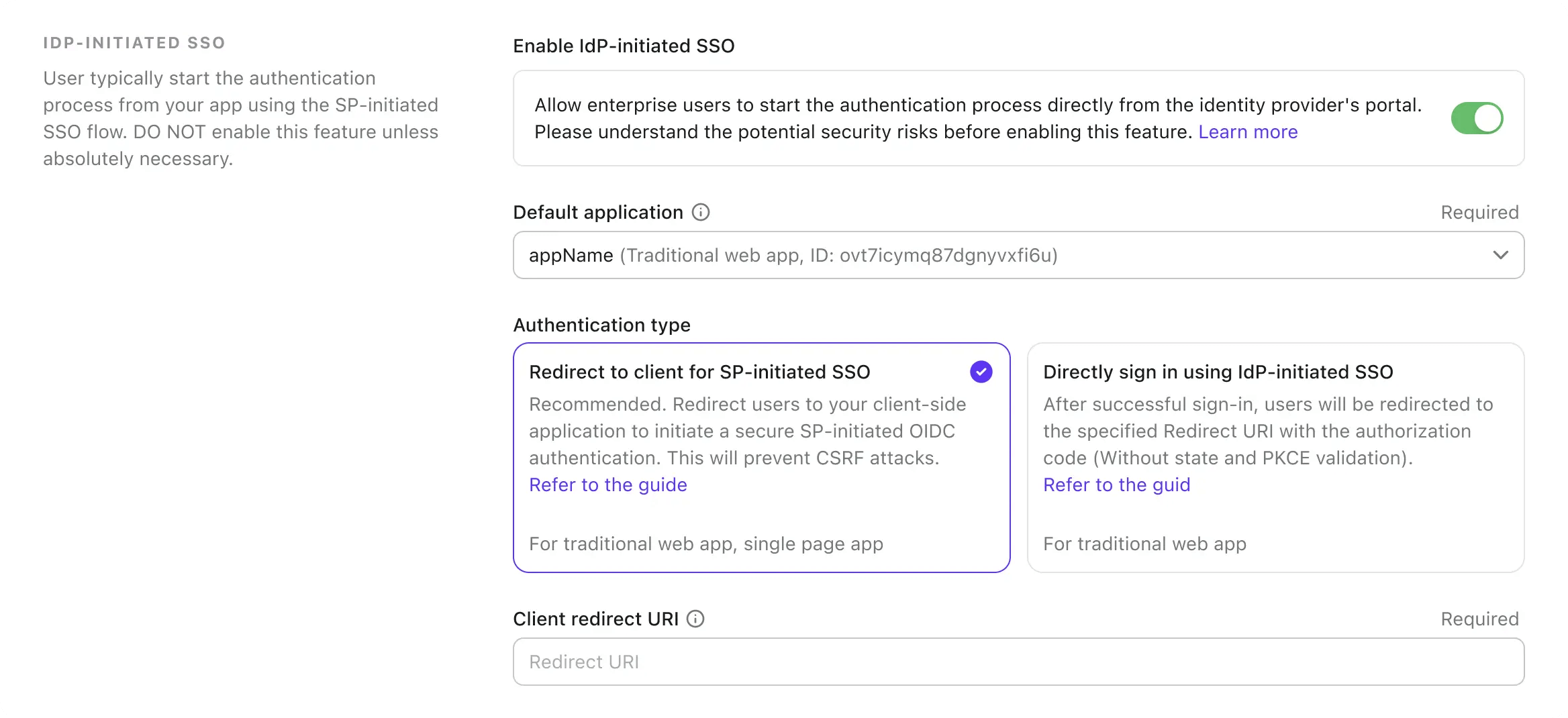 It is highly recommended to use a dedicated redirect URI for IdP-initiated SSO. Given that the authentication request is unsolicited, the client application should manage the response independently, separate from the standard SP-initiated authentication flow.