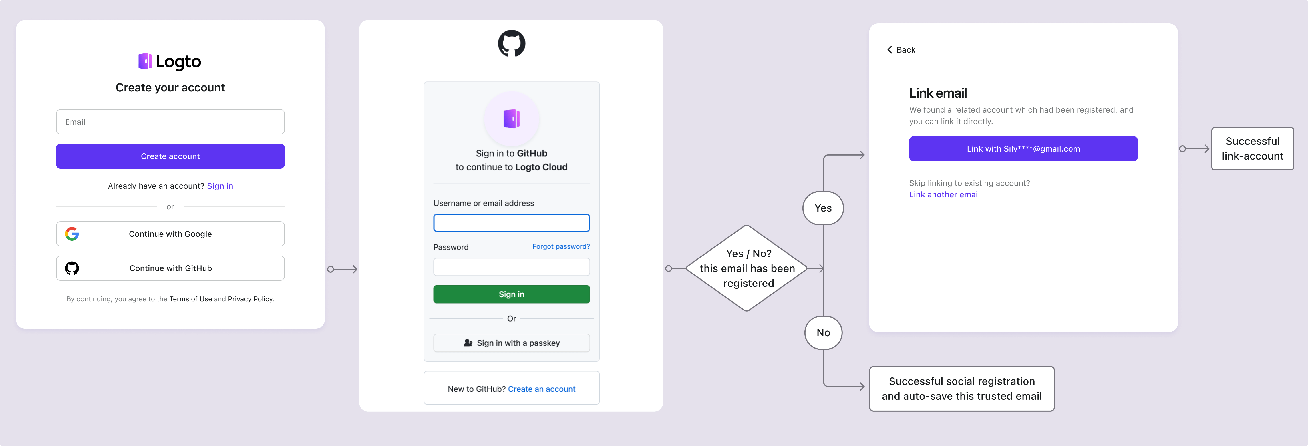 If the social identity provides an email address that is already registered in the Logto system, the user will be prompted to link the social account to the existing account or create a new account. If the user selects to create a new account, they will be prompted to provide a new email address and verify it.